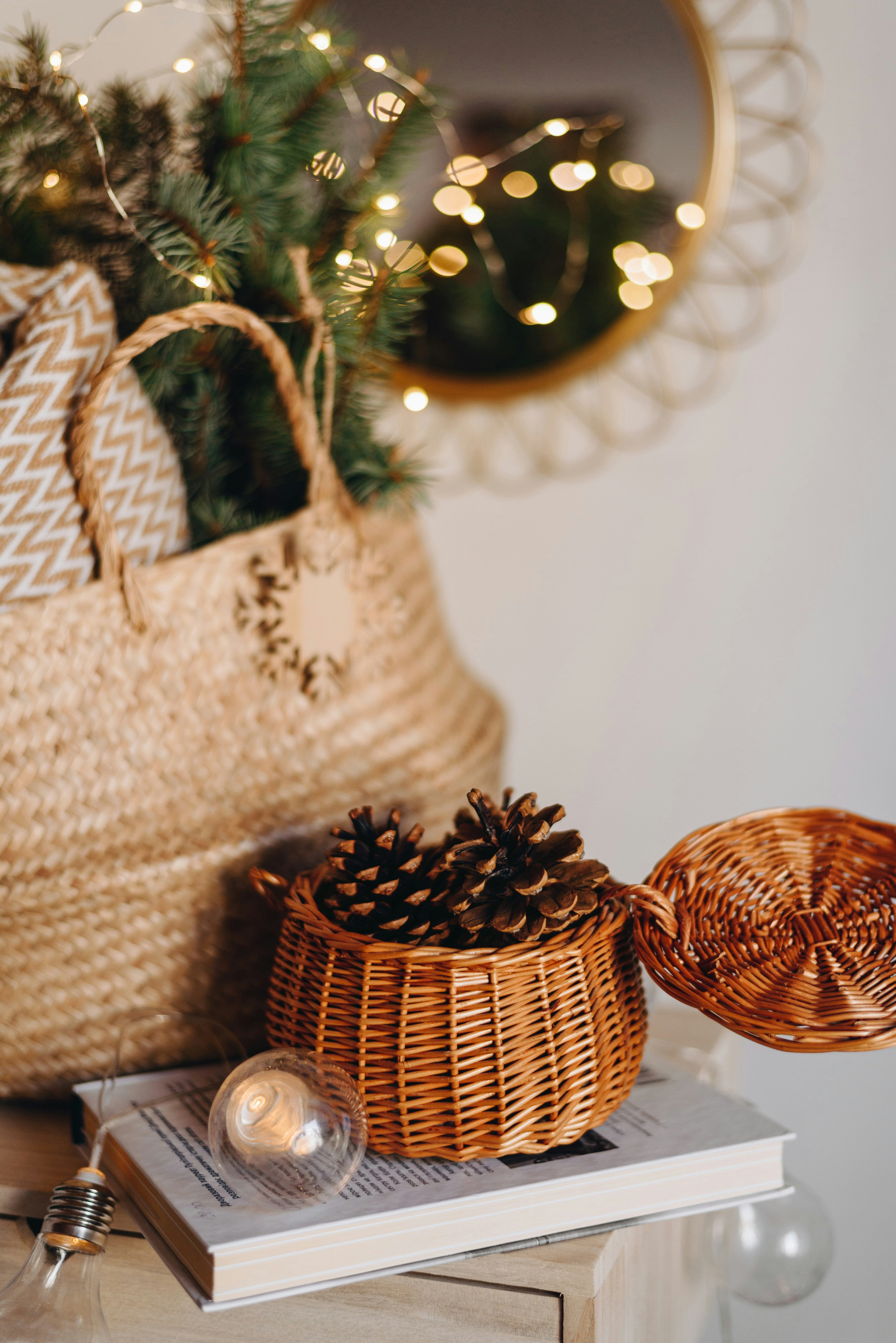 One way to bring natural textures into the home this time of year is through woven baskets made of natural materials. I’m a big fan of using natural baskets as opposed to say a plastic laundry hamper or serving bowl. A classic option would be fill a natural basket with greenery or Christmas ornaments as a seasonal decoration.